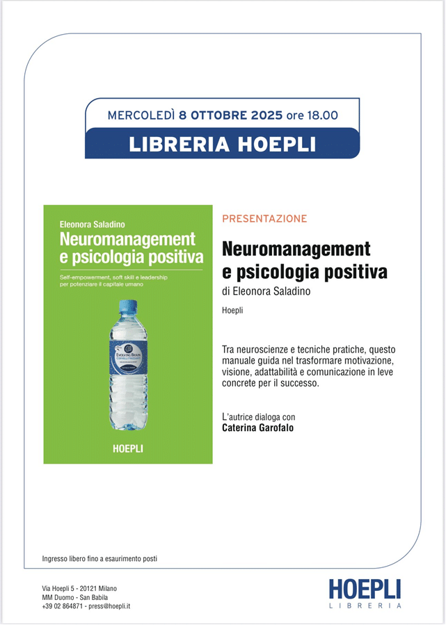 Siamo lieti di annunciare l’uscita del nuovo volume della nostra docente Eleonora Saladino, pubblicato da Hoepli e intitolato Neuromanagement e psicologia positiva. Il libro unisce neuroscienze, soft skill e psicologia positiva per offrire strumenti pratici a manager, professionisti e leader che vogliono sviluppare motivazione, adattabilità, visione e comunicazione efficace.Un manuale che traduce conoscenze scientifiche in […]